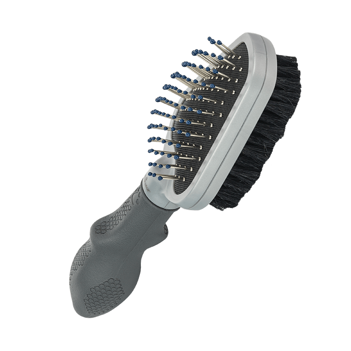 Jedna strona ułatwia rozczesywanie kołtunów i czyści sierść; druga z miękkiego naturalnego włosia dzika, dba o blask i doskonały wygląd i sierści naszego czworonoga.