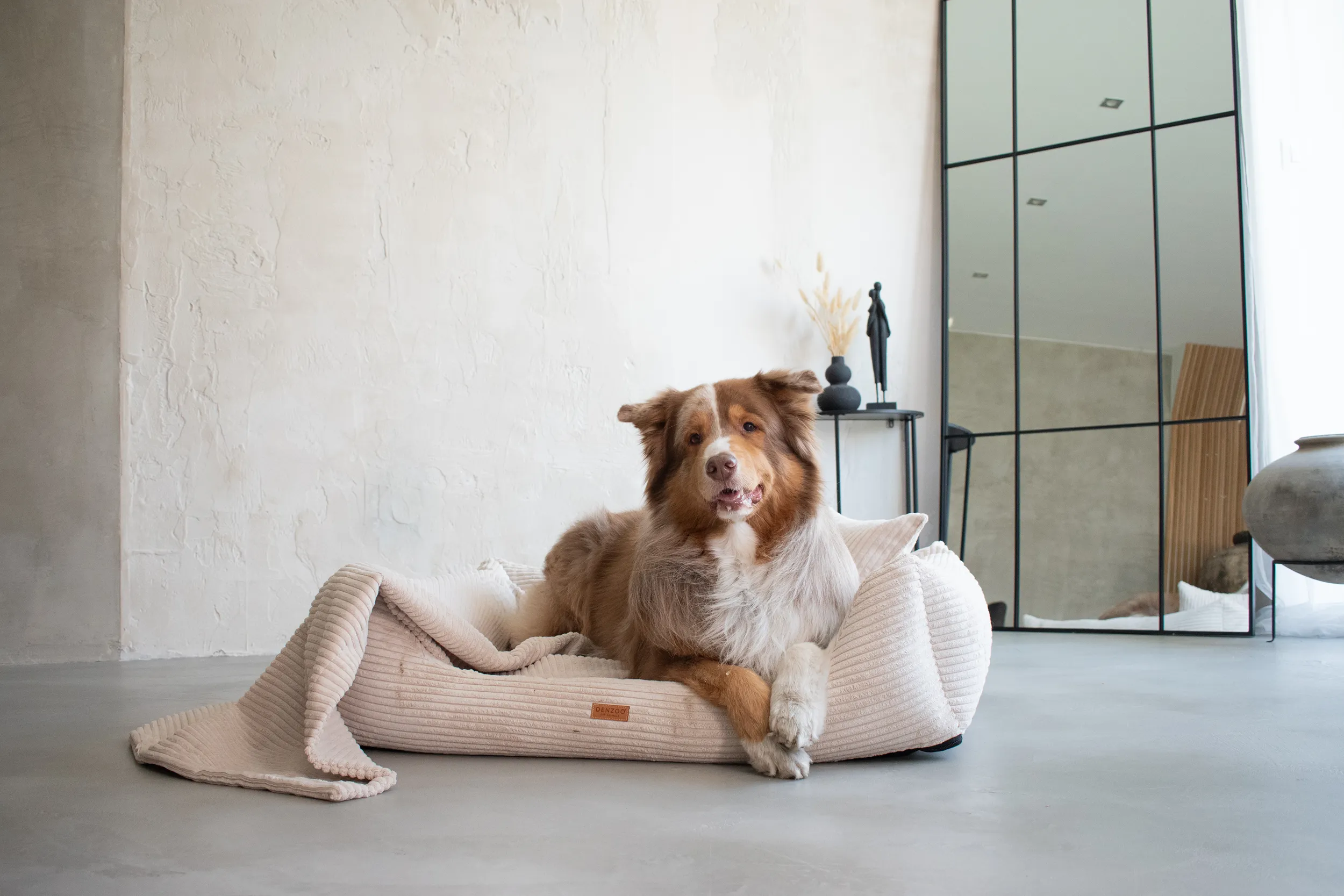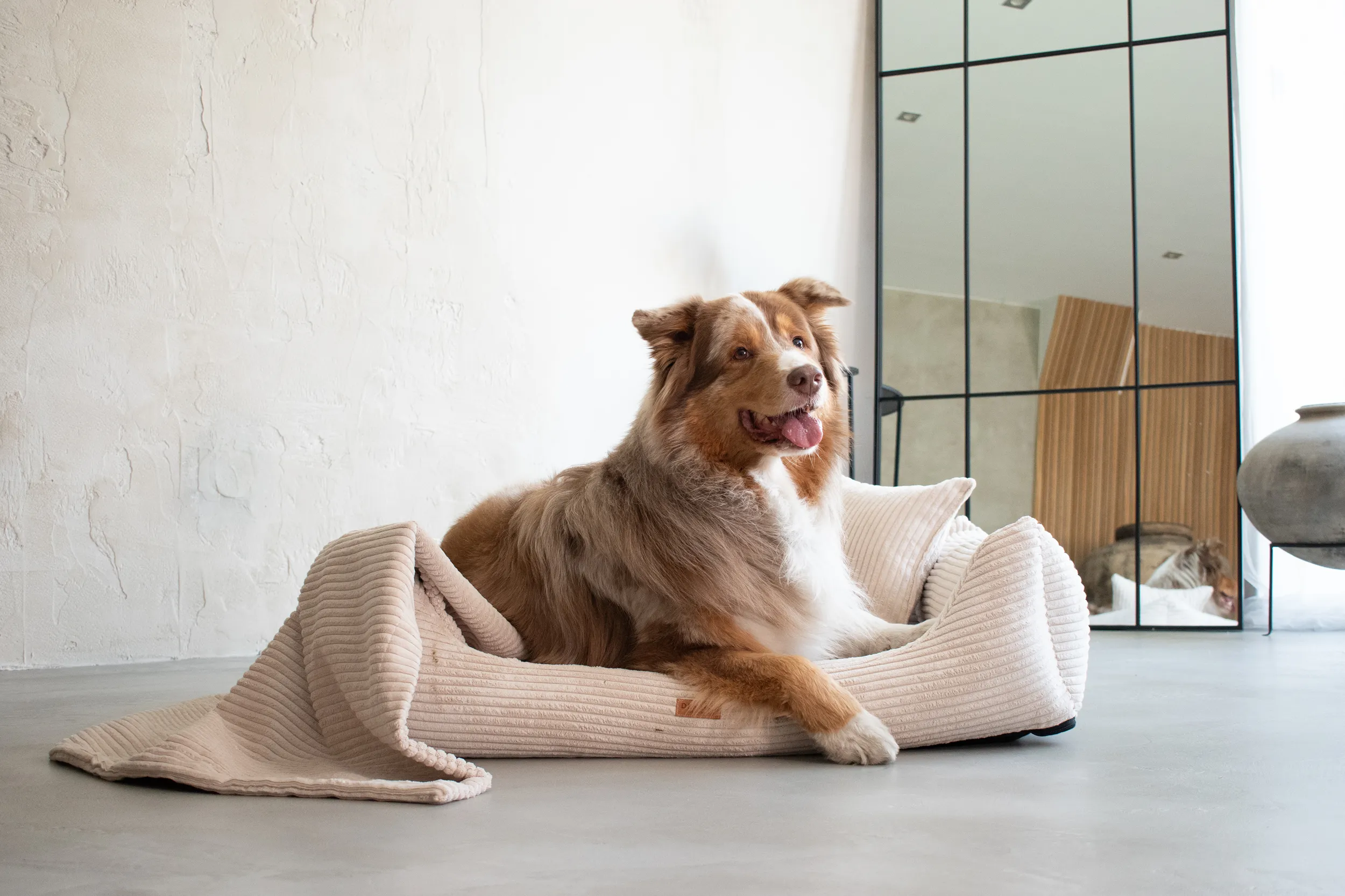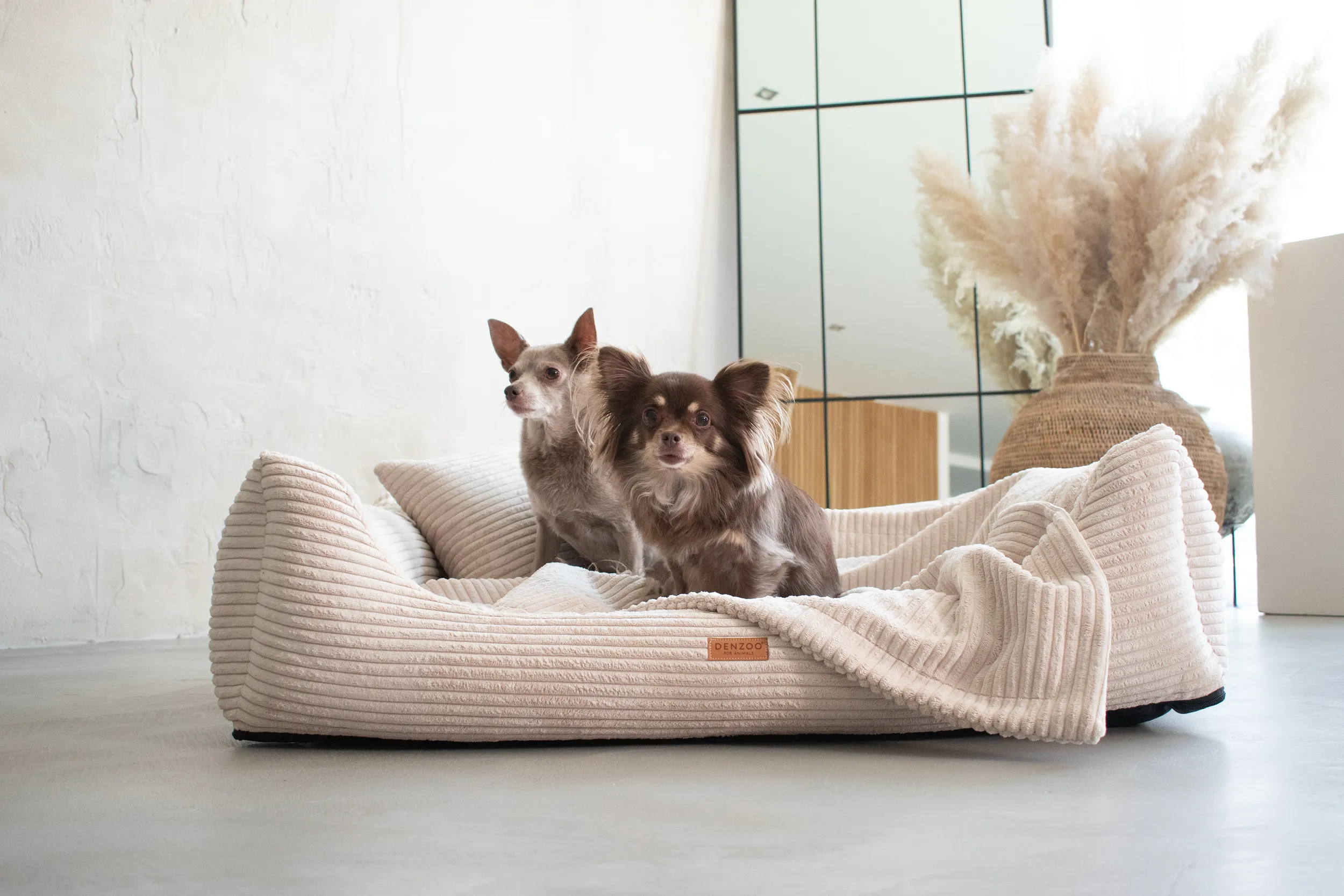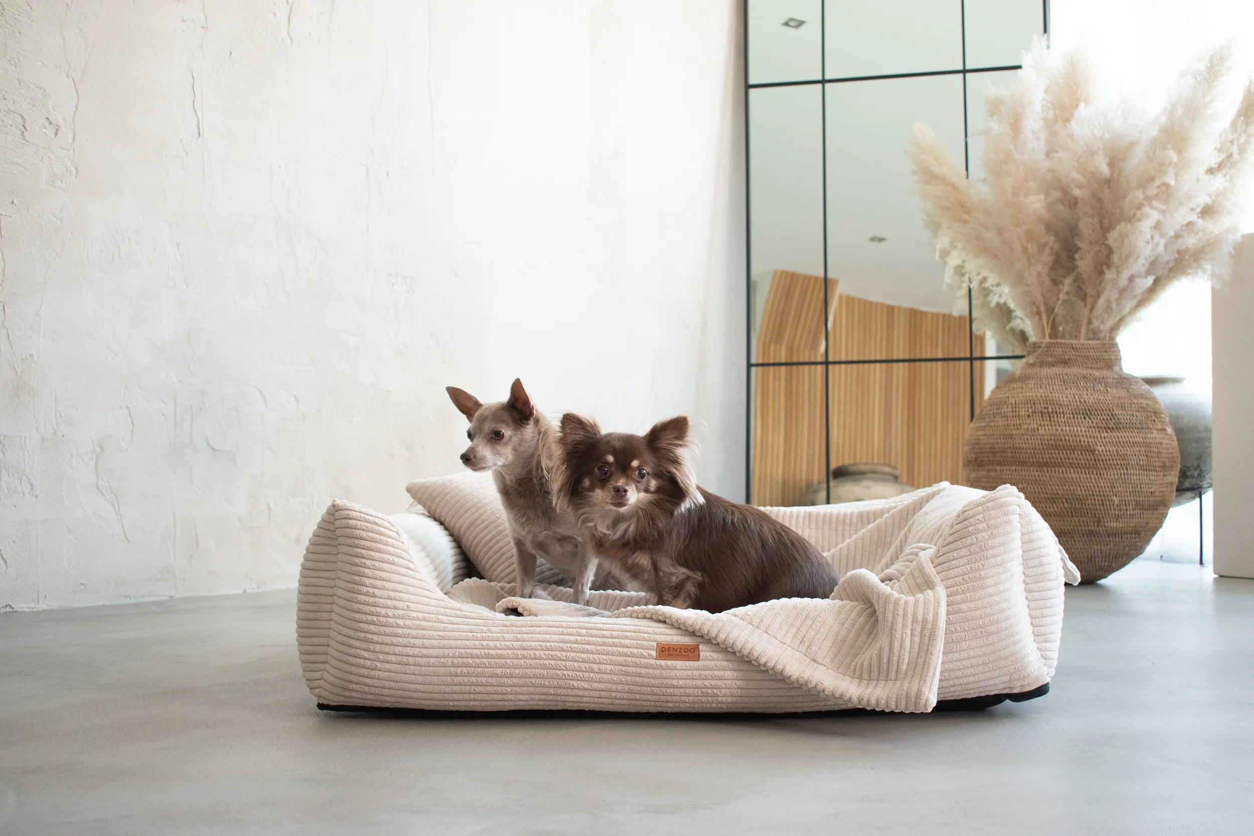 Stylowe, beżowe legowisko z materacem ortopedycznym VISCO MEMORY dba o stawy i kręgosłup psa lub kota, a dzięki tkaninie tapicerskiej premium świetnie wygląda w każdym wnętrzu.